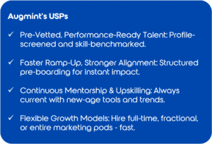 Augmint bridges this gap by curating marketing talent, not just recruiting it. Our proprietary methodology identifies and develops high-potential marketers into well-rounded professionals – ready to deliver measurable impact and build long-term, purpose-driven careers.